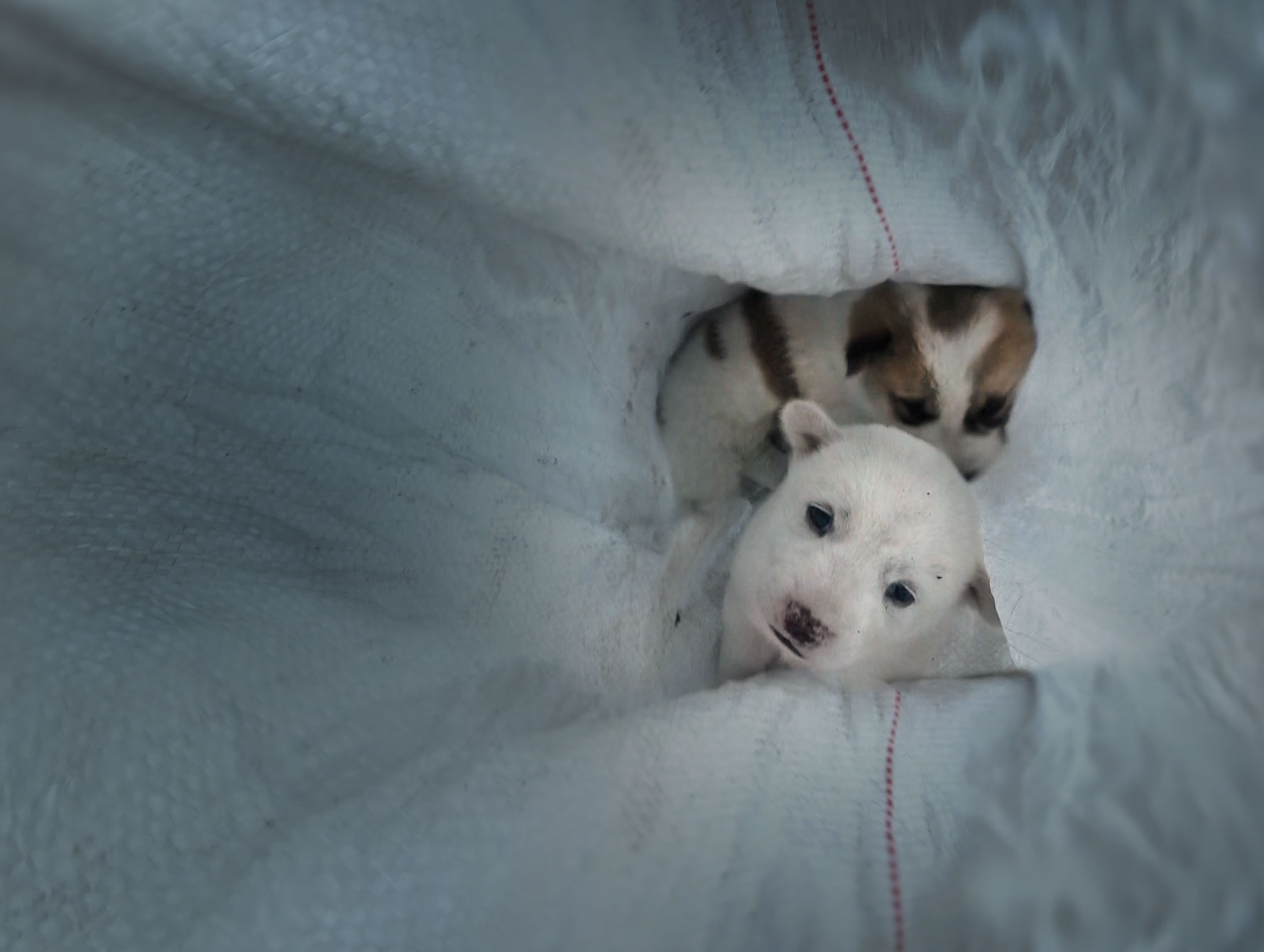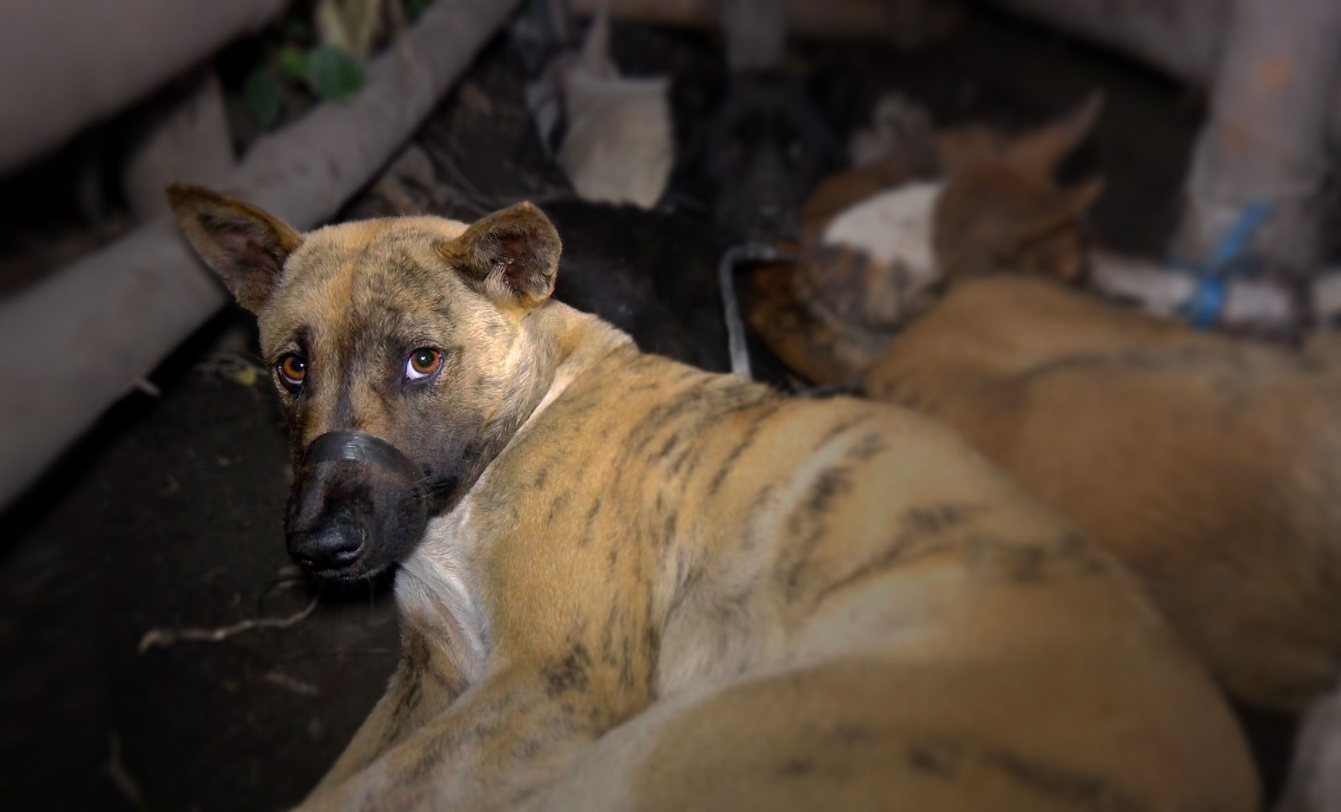 Dumped in bamboo crates or plastic rice sacks, terrified dogs await the nightly slaughter with legs tied and mouths taped shut. They may languish like this for hours or days without food or water. One by one they will be brutally slaughtered in full view of their companions.